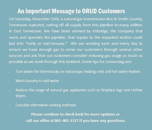 The rupture in the natural gas transmission line cut off all supply from the pipeline to many utilities in East Tennessee, ORUD said.