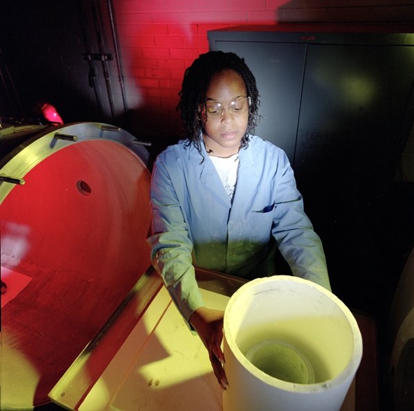 A microwave operator handles the crucible that holds the material as it is melted. Microwave technology is the preferred method for melting materials because of the ease of removing carbon impurities from the metal. (Photos courtesy B&W Y-12)